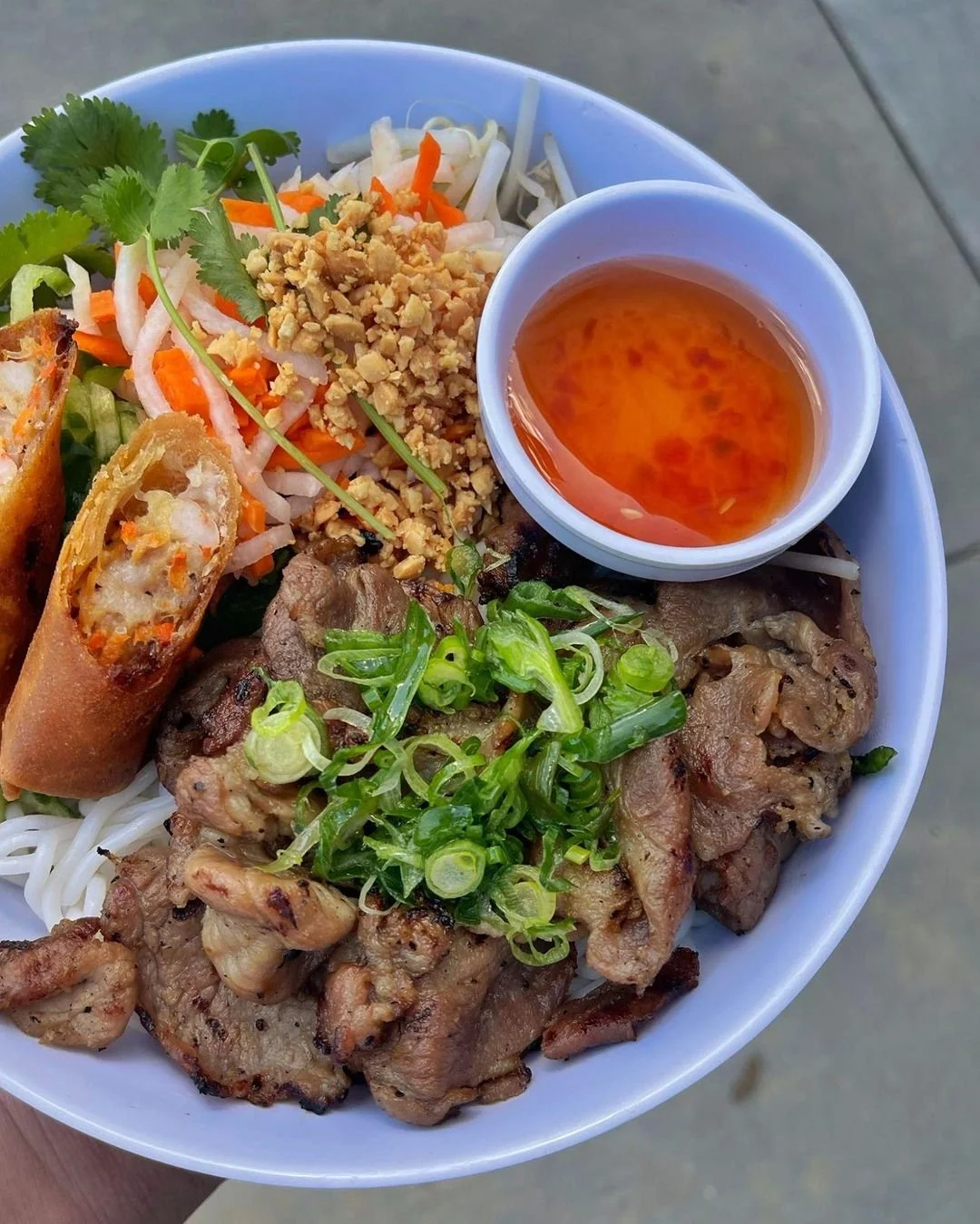 Cold vermicelli noodles served on a bed of lettuce, fresh herbs, cucumbers, bean sprouts, pickled carrots/daikon and peanuts. Served with fish sauce.